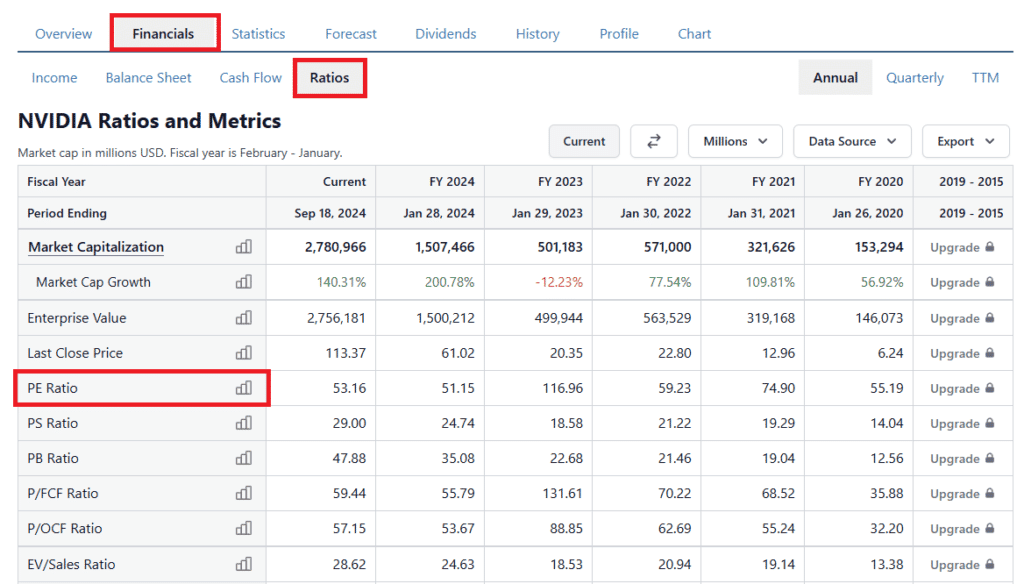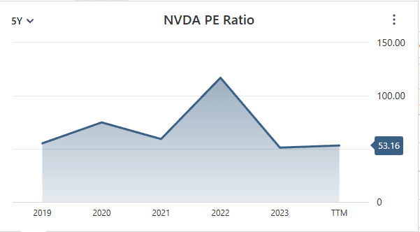 P/E съотношението на NVIDIA, към момента на писане на тази статия, е 53.16.