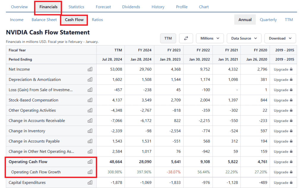 Тази информация се намира във Financials → Cash Flow.