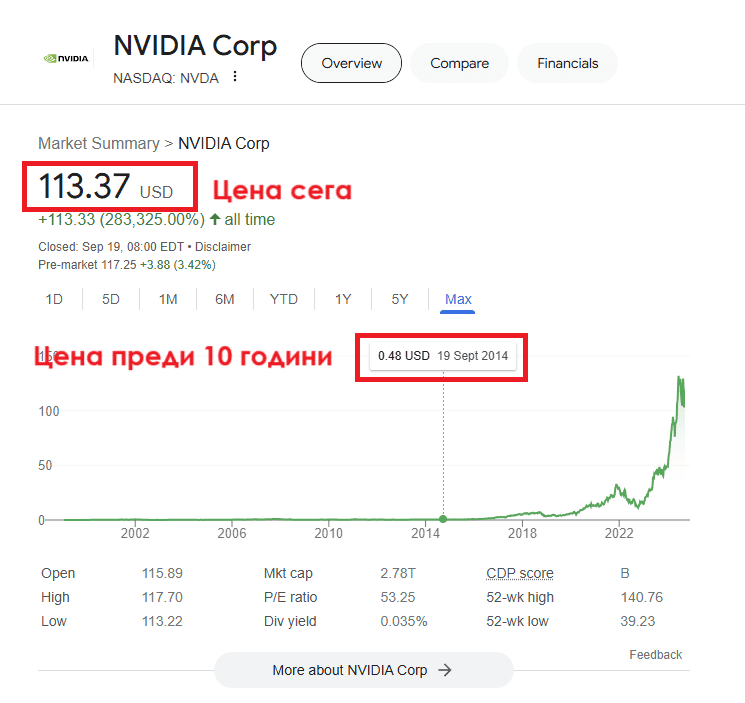 Търсим акцията на NVIDIA и преглеждаме графиката, за да открием цената ѝ преди 10 години. 0,48 USD.