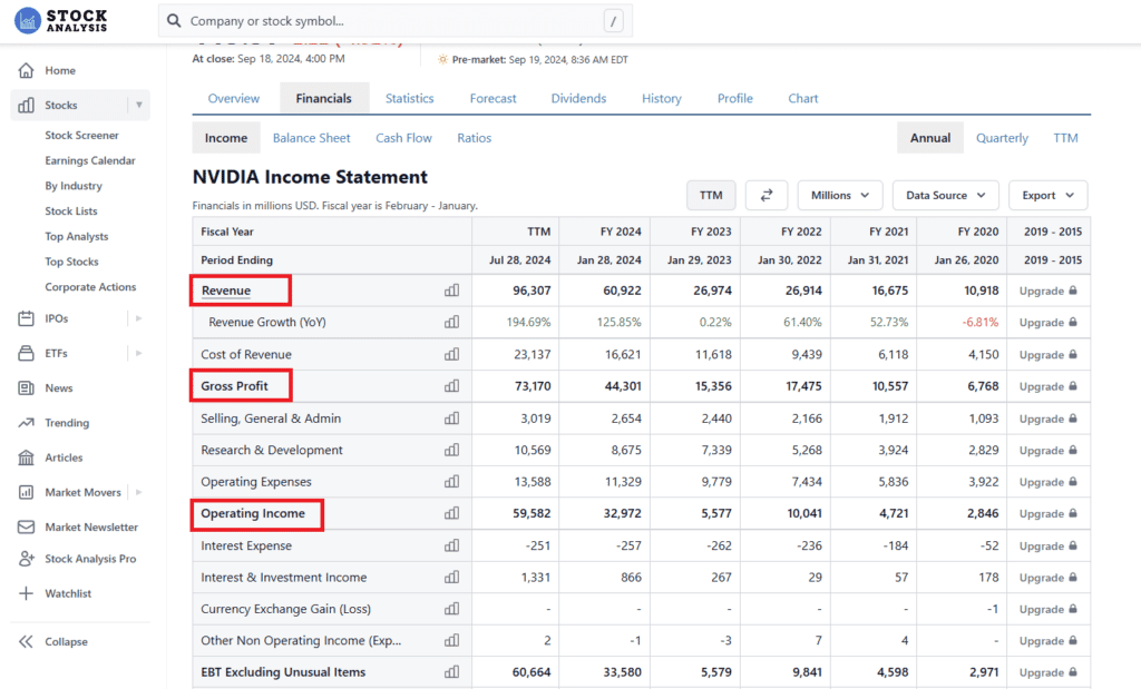 Данни за финансите на компаниите може да откриете свободно онлайн в сайт като StockAnalysis.