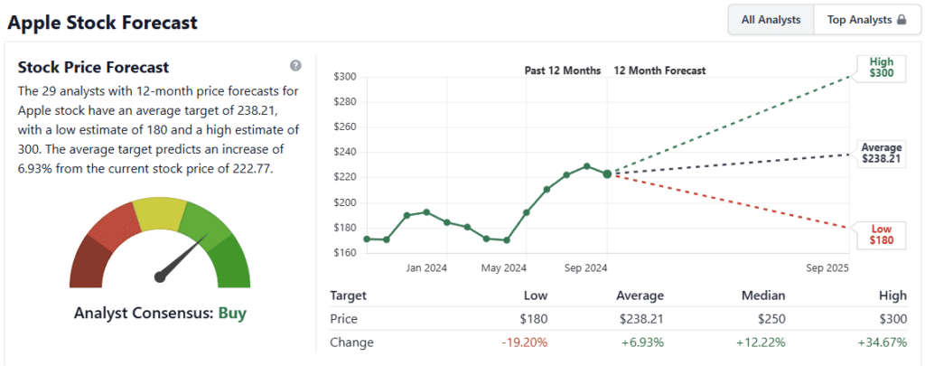 Според 12-месечните прогнози на финансовите анализатори в Stock Analysis, цената на акции Apple може да достигне до $300 през следващата 1 година.