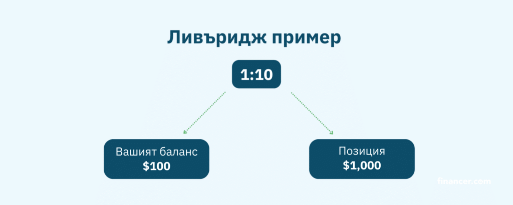 - Ливъридж пример: при съотношение 1:10 и ваш баланс от $100, управлявате позиция от $1,000. При промяна на цената с 10% в положителна за вас посока, ще спечелите $100, НО при движение от 10% в негативна за вас посока... ще изгубите целият си баланс.
