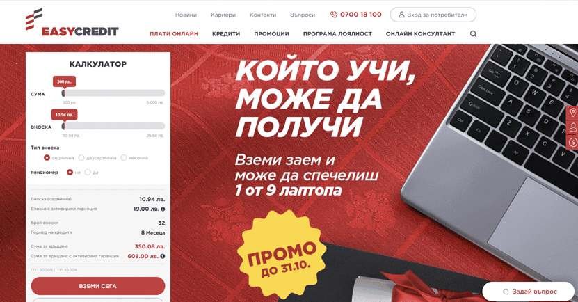 | Изи Макс | 9000 лв (4601,64 €) | Двуседмични | До 26 вноски | Лична карта и постоянен трудов договор |