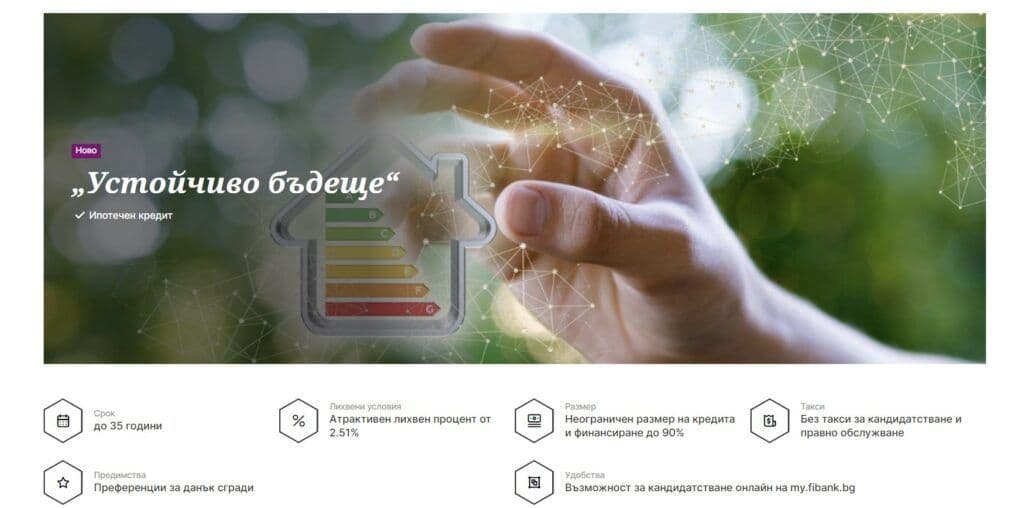 Ипотечен кредит Fibank е с наименование "Устойчиво бъдеще" и има неограничен размер, като финансирането представлява до 90% от пазарната стойност на имота.