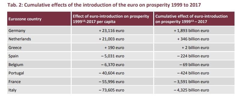 Доклад публикуван от Центъра за Европейска политика през февруари 2019-та и озаглавен **"Еврото на 20 години: победители и губещи" **също ясно визуализира разликите между някои държави използващи еврото от 1999 насам.