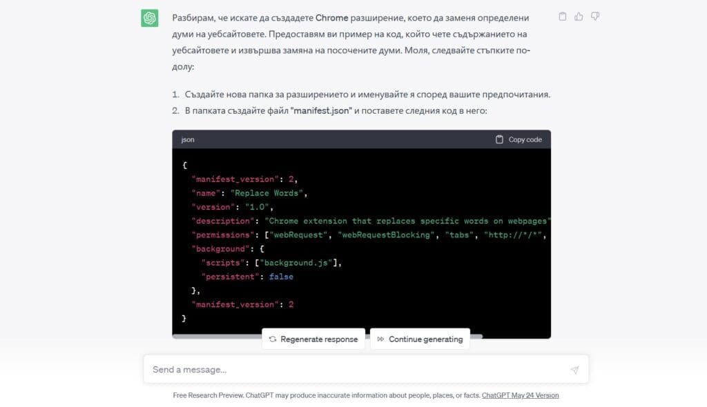 ChatGPT не само ще ви даде скрипт за разширението, но и ще ви посочи точните стъпки, които трябва да следвате, за да го материализирате.