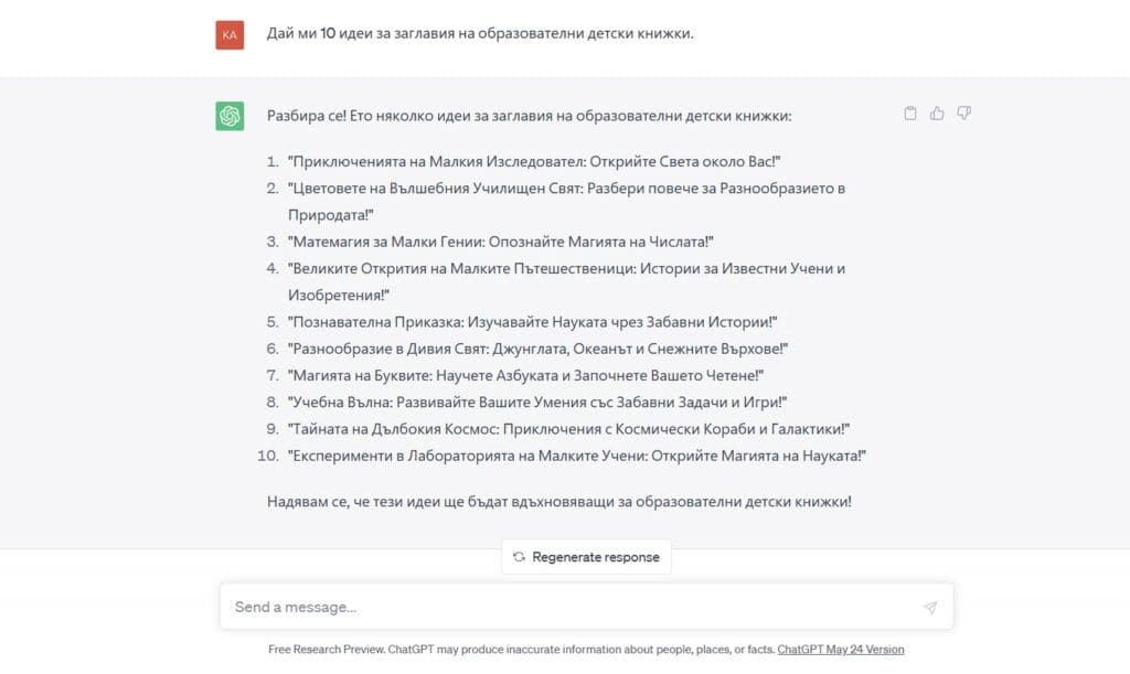 Имайте предвид, че данните в безплатната версия на ChatGPT към момента са актуализирани до септември 2021 година. Тоест, някои от включените отговори могат вече да не са актуални на пазара и самият ChatGPT ще ви предупреди за това.