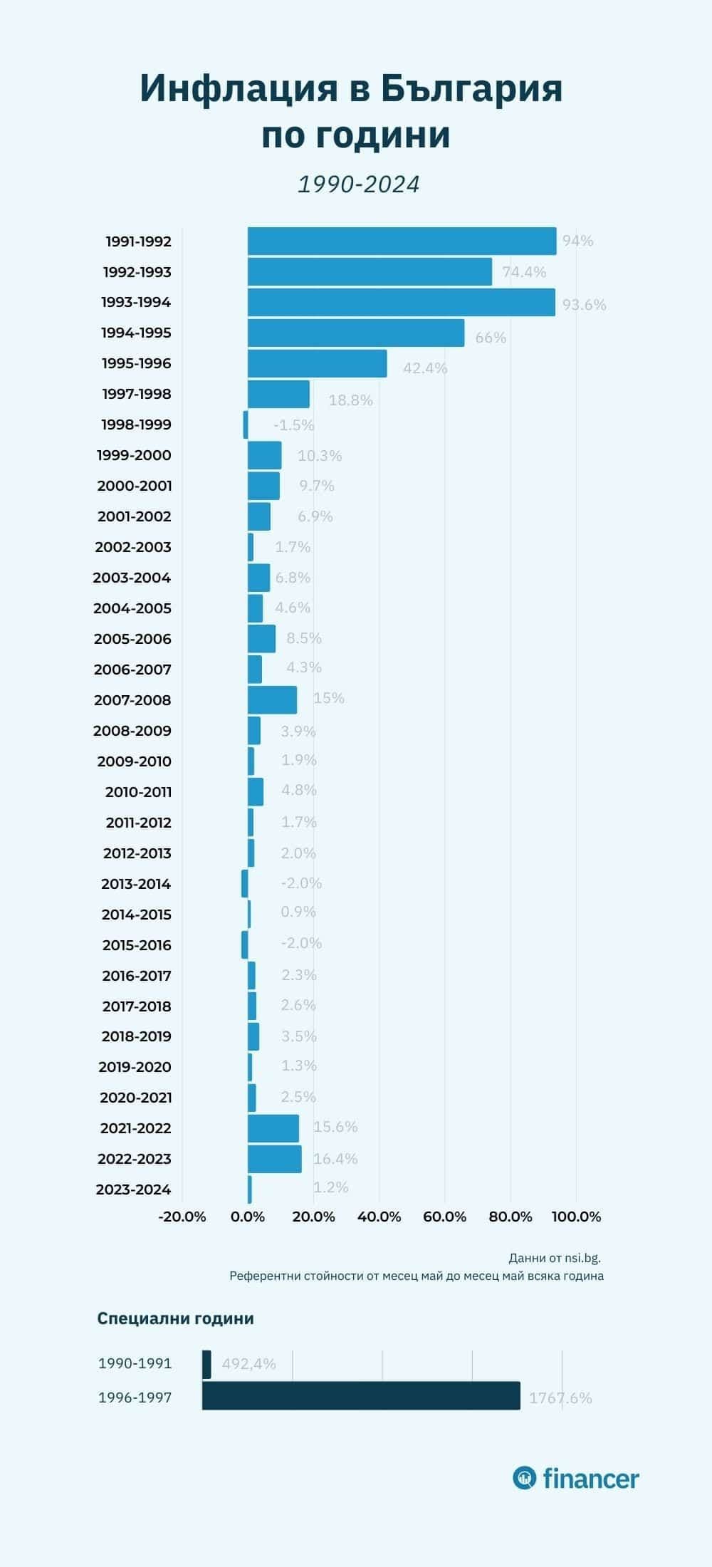 Следващата графика изразява инфлацията в България по години от 1990 насам.