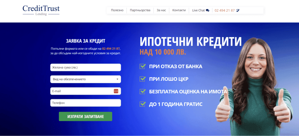 Кредит Тръст не начислява такси за кандидатстване, усвояване и управление на кредита. Оценката на имота също е безплатна.