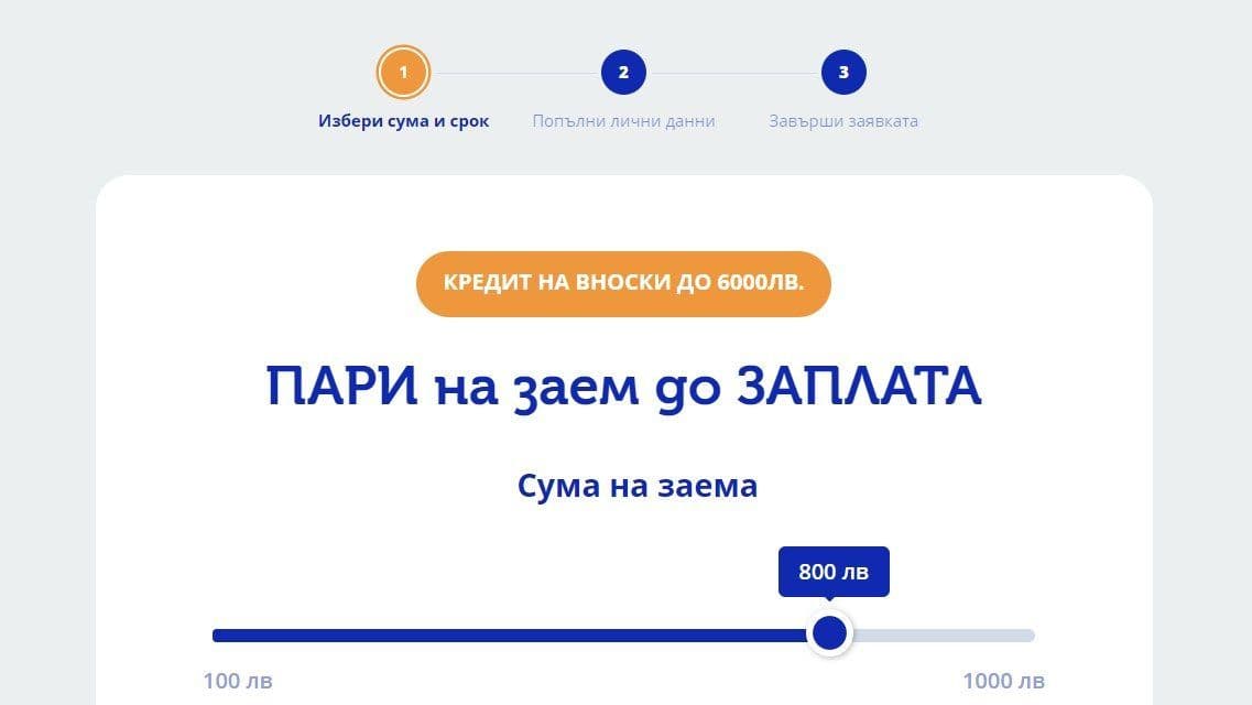 | Размер на кредита | От 100 лв (51,13 €) до 1000 лв (511,30 €) за заем до заплата и от 400 лв (204,52 €) до 7000 лв (3579,07 €) за кредит на вноски |