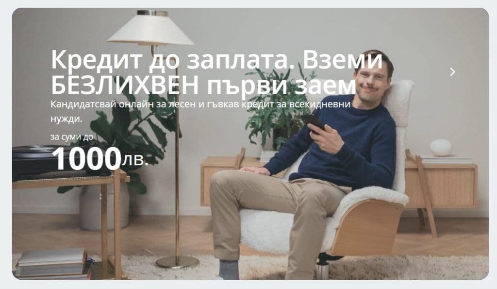 Ако за пръв път обмисляте кандидатстването за кредит към тази компания, можете да вземете заем до заплата с 0% лихва и 0 лева такси, и да върнете точно толкова, колкото сте взели в срок до 30 дни. Отпусканите суми варират от 100 (51,13 €) до 1000 лева (511,30 €).