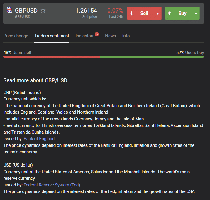 Индикатори за пазарните нагласи - Платформата има също индикатори, които показват какви са настроенията в момента на пазара за дадения актив. Когато започвате това може да ви бъде полезен ориентир.
