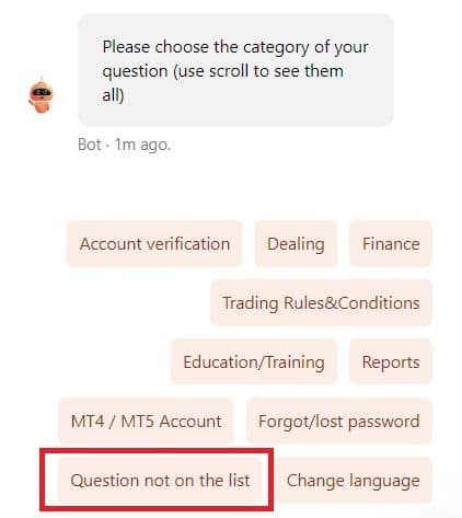 Както при всички други в днешно време, комуникацията започва с бот. Добрата новина е, че още от самото начало има опция "Question not on the list", която ще ви прехвърли към истински агент.